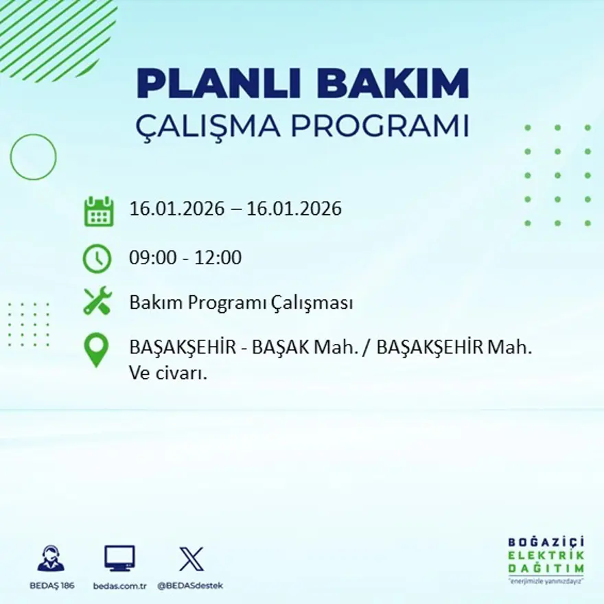 Yetkililer, çalışmaların elektrik altyapısının güçlendirilmesi ve olası arızaların önüne geçilmesi amacıyla yapıldığını belirtirken, vatandaşların mağduriyet yaşamamaları için önlem almaları konusunda uyarıda bulundu. Kesintiden etkilenecek mahalle ve sokaklara ilişkin detaylı listeye BEDAŞ’ın resmi internet sitesi üzerinden ulaşılabileceği bildirildi.